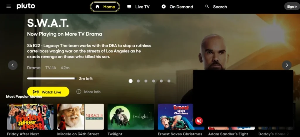 Pluto TV blends live television channels with on-demand movies, creating a cable-like experience without any cost. Instead of selecting only individual titles, users can watch scheduled movie channels, genre-specific stations, and entertainment programming that runs continuously throughout the day.